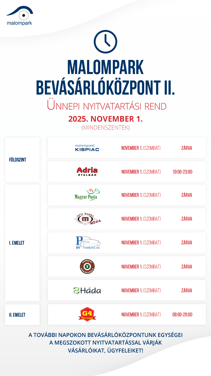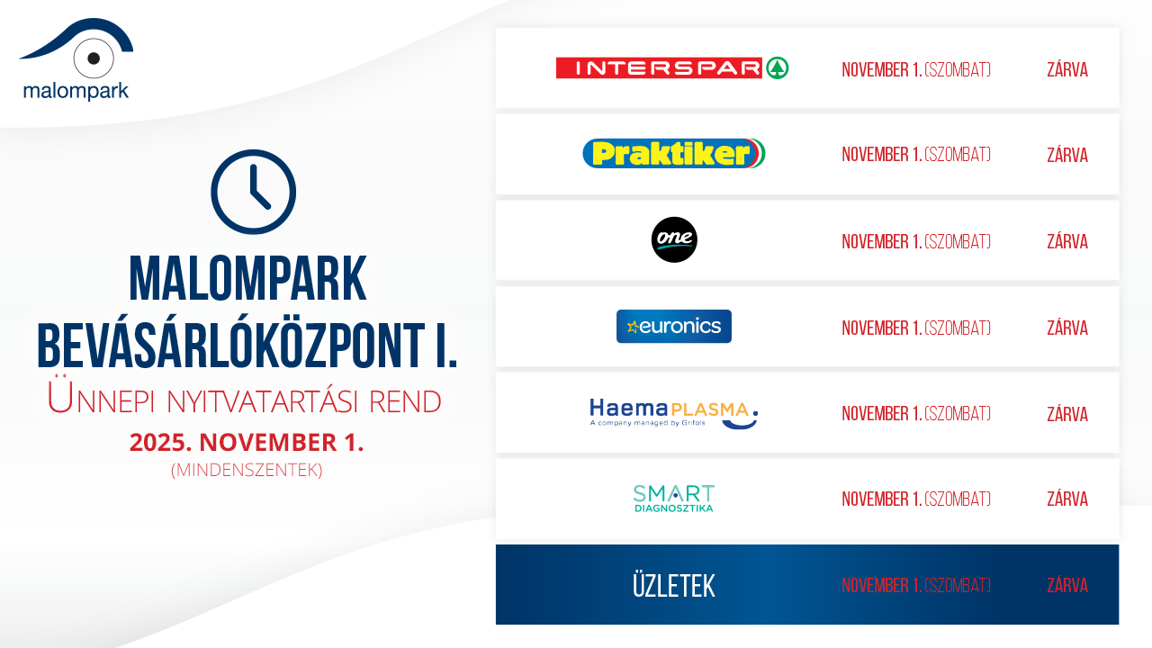 Tekintse meg a Malompark Bevásárlóközpont ünnepi nyitvatartását: www.malompark.hu/hu/uzletek-unnepi-nyitvatartas